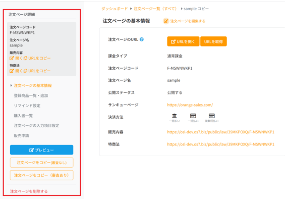 - 注文ページ詳細画面の左サイドメニュー[注文ページの基本情報]を選択します。