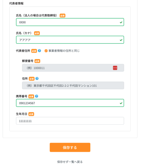 指名、カナ、代表者住所、携帯番号、生年月日を入力してください。