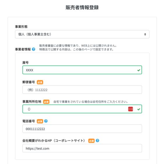 前のページで登録した販売者情報が反映されます。