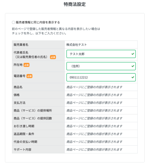 「販売者情報と同じ内容を表示する」のチェックを入れると