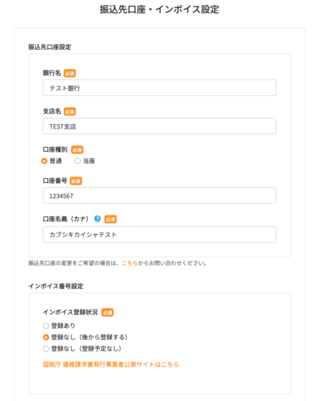 このページでは、振込先口座とインボイス設定について確認することができます。